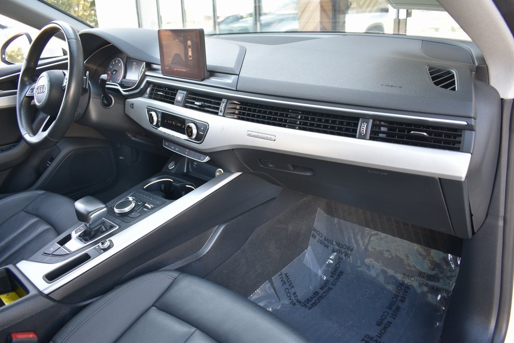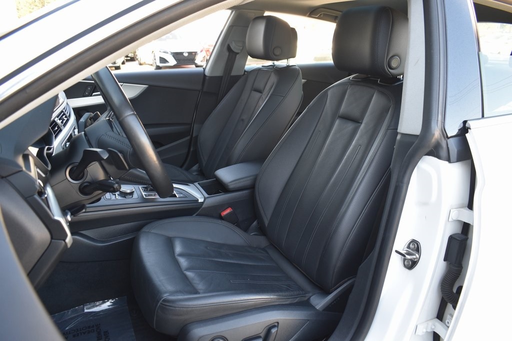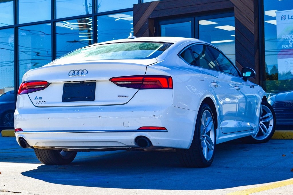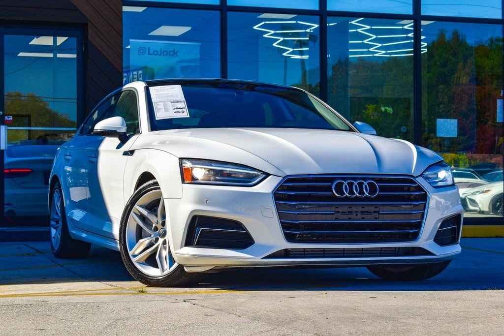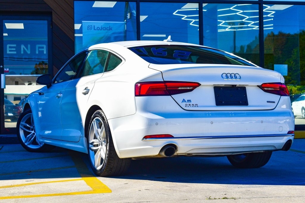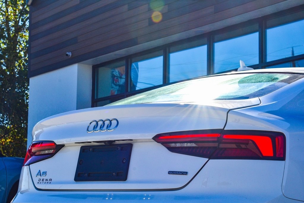 White 2019 Audi A5 Sportback Premium quattro quattro 7-Speed Automatic S tronic 2.0L 4-Cylinder TFSI 10 Speakers, 4-Wheel Disc Brakes, ABS brakes, Air Conditioning, Alloy wheels, Anti-whiplash front head restraints, Audi smartphone interface (Apple CarPlay/Android Auto), Auto-dimming Rear-View mirror, Automatic temperature control, Brake assist, Bumpers: body-color, Compass, Delay-off headlights, Driver door bin, Driver vanity mirror, Dual front impact airbags, Dual front side impact airbags, Electronic Stability Control, Emergency communication system: Audi connect CARE, Exterior Parking Camera Rear, Four wheel independent suspension, Front anti-roll bar, Front Bucket Seats, Front Center Armrest, Front dual zone A/C, Front fog lights, Front reading lights, Garage door transmitter: HomeLink, Heated door mirrors, Heated front seats, Heated Front Sport Seats, Illuminated entry, Knee airbag, Leather Seating Surfaces, Leather Shift Knob, Leather steering wheel, Low tire pressure warning, Occupant sensing airbag, Outside temperature display, Overhead airbag, Overhead console, Panic alarm, Passenger door bin, Passenger vanity mirror, Power adjustable front head restraints, Power door mirrors, Power driver seat, Power Liftgate, Power moonroof, Power passenger seat, Power steering, Power windows, Radio data system, Radio: Audi Sound System, Rain sensing wipers, Rear air conditioning, Rear anti-roll bar, Rear reading lights, Rear seat center armrest, Rear window defroster, Remote keyless entry, Security system, Speed control, Speed-sensing steering, Speed-Sensitive Wipers, Split folding rear seat, Steering wheel mounted audio controls, Tachometer, Telescoping steering wheel, Tilt steering wheel, Traction control, Trip computer, Turn signal indicator mirrors, Variably intermittent wipers, Wheels: 18" x 8.5" 5-Arm-Dynamic Design.