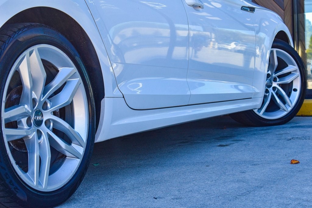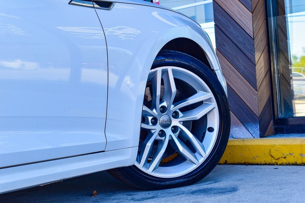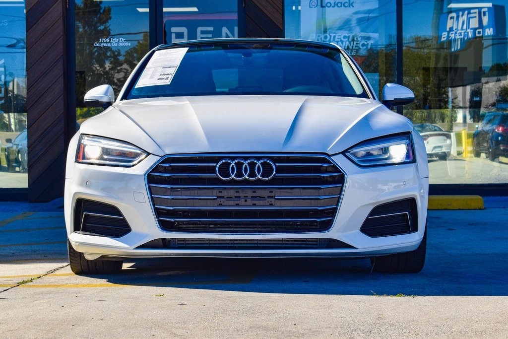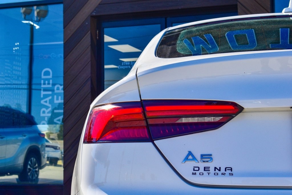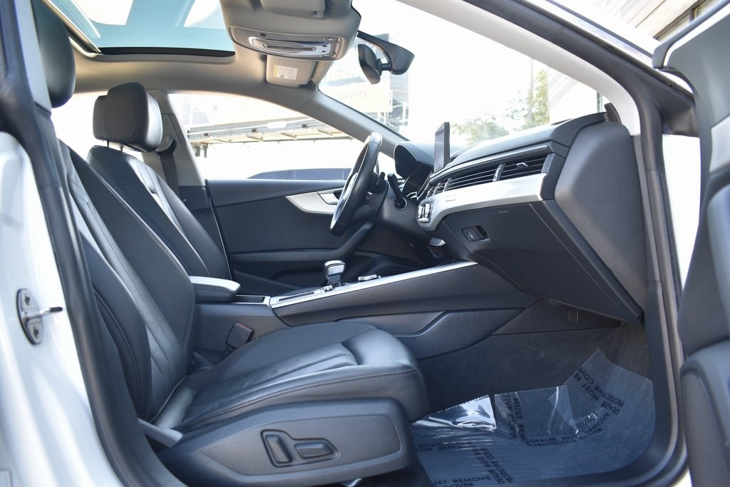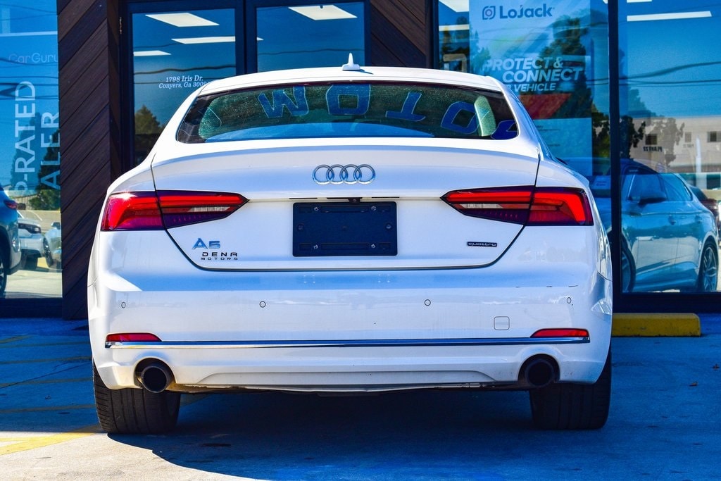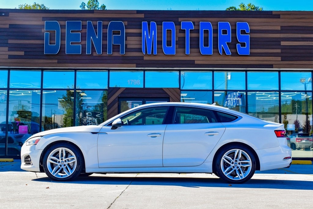 White 2019 Audi A5 Sportback Premium quattro quattro 7-Speed Automatic S tronic 2.0L 4-Cylinder TFSI 10 Speakers, 4-Wheel Disc Brakes, ABS brakes, Air Conditioning, Alloy wheels, Anti-whiplash front head restraints, Audi smartphone interface (Apple CarPlay/Android Auto), Auto-dimming Rear-View mirror, Automatic temperature control, Brake assist, Bumpers: body-color, Compass, Delay-off headlights, Driver door bin, Driver vanity mirror, Dual front impact airbags, Dual front side impact airbags, Electronic Stability Control, Emergency communication system: Audi connect CARE, Exterior Parking Camera Rear, Four wheel independent suspension, Front anti-roll bar, Front Bucket Seats, Front Center Armrest, Front dual zone A/C, Front fog lights, Front reading lights, Garage door transmitter: HomeLink, Heated door mirrors, Heated front seats, Heated Front Sport Seats, Illuminated entry, Knee airbag, Leather Seating Surfaces, Leather Shift Knob, Leather steering wheel, Low tire pressure warning, Occupant sensing airbag, Outside temperature display, Overhead airbag, Overhead console, Panic alarm, Passenger door bin, Passenger vanity mirror, Power adjustable front head restraints, Power door mirrors, Power driver seat, Power Liftgate, Power moonroof, Power passenger seat, Power steering, Power windows, Radio data system, Radio: Audi Sound System, Rain sensing wipers, Rear air conditioning, Rear anti-roll bar, Rear reading lights, Rear seat center armrest, Rear window defroster, Remote keyless entry, Security system, Speed control, Speed-sensing steering, Speed-Sensitive Wipers, Split folding rear seat, Steering wheel mounted audio controls, Tachometer, Telescoping steering wheel, Tilt steering wheel, Traction control, Trip computer, Turn signal indicator mirrors, Variably intermittent wipers, Wheels: 18" x 8.5" 5-Arm-Dynamic Design.
