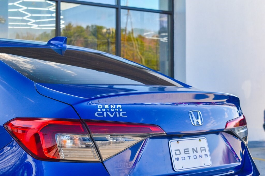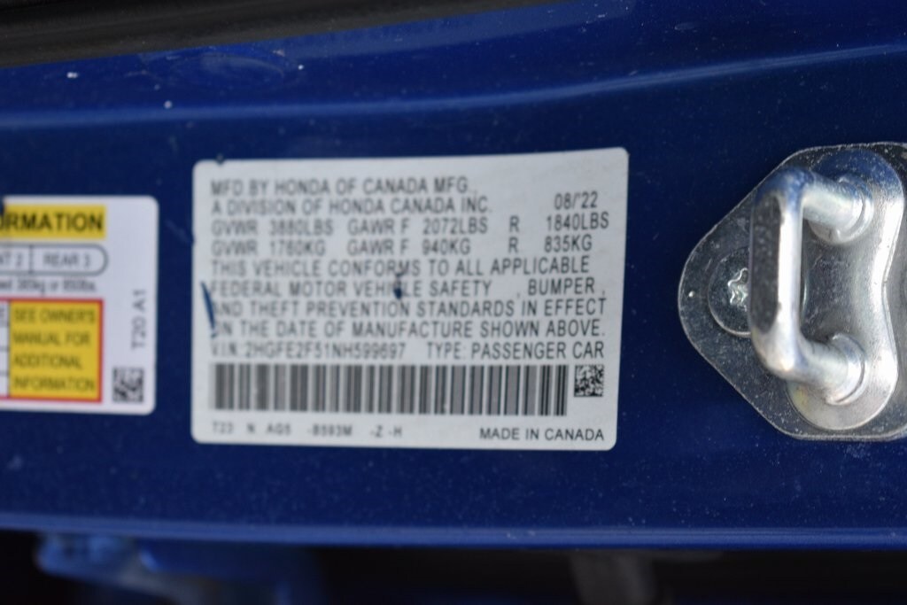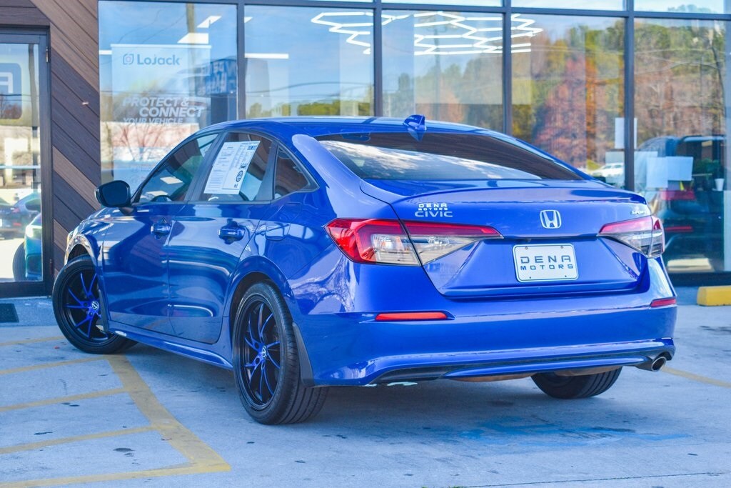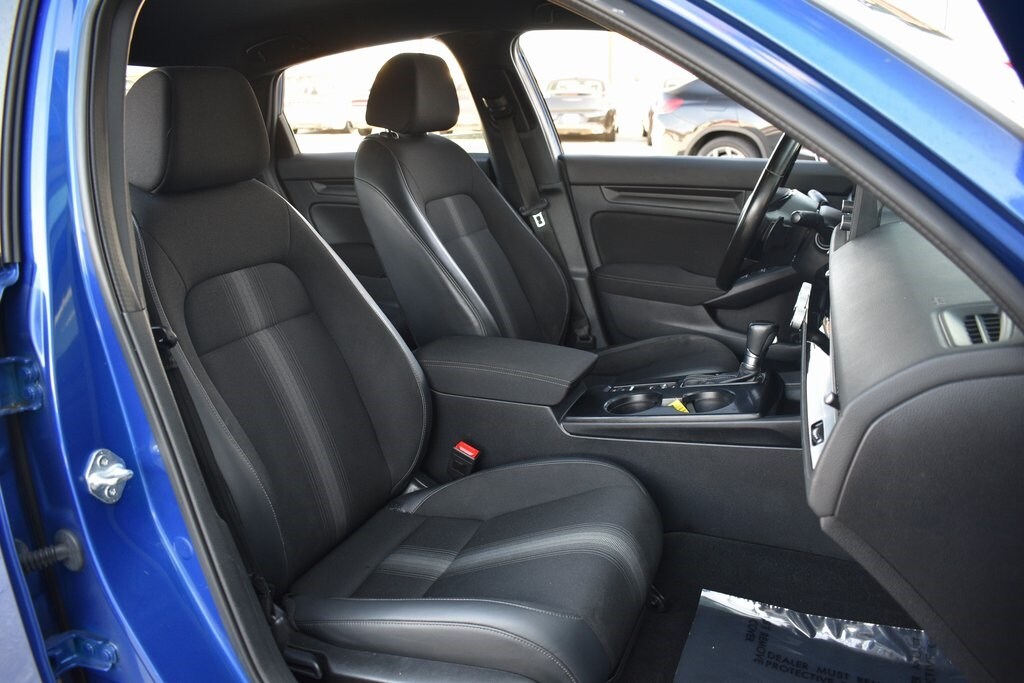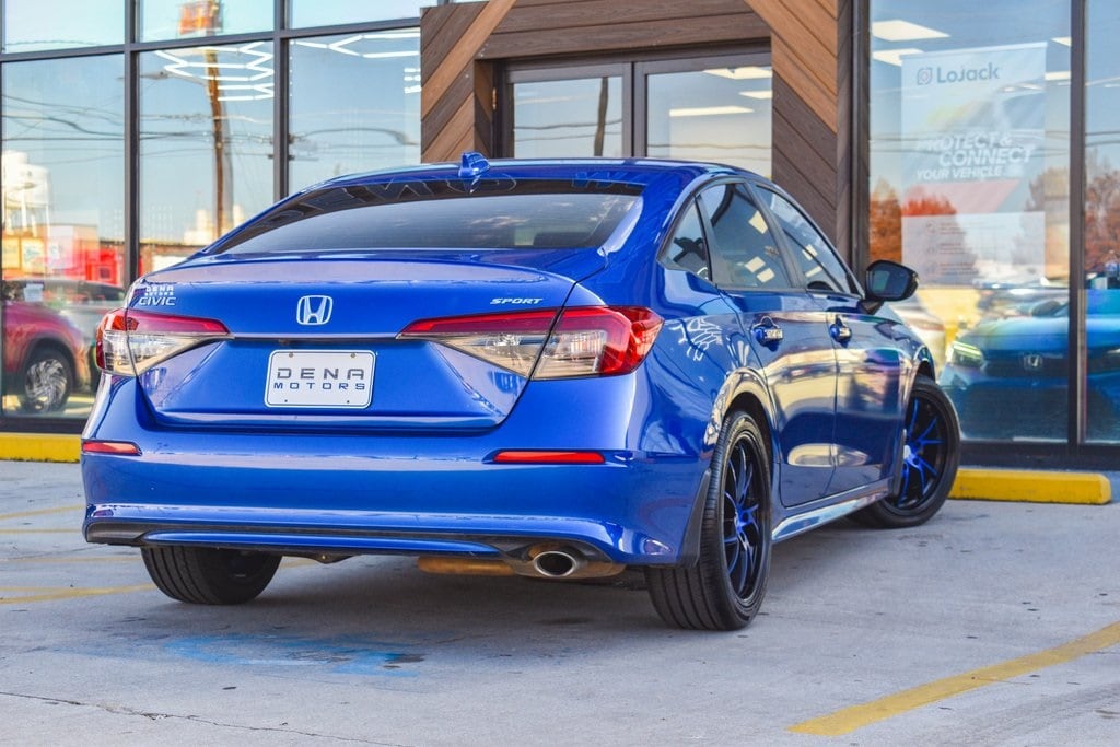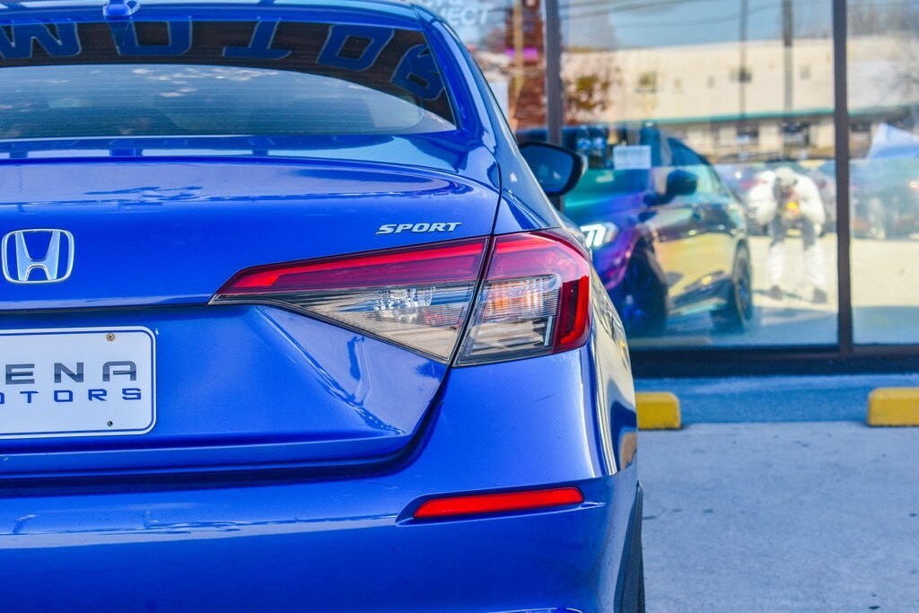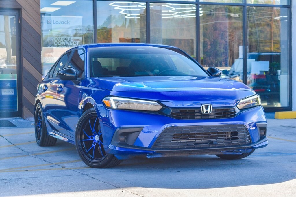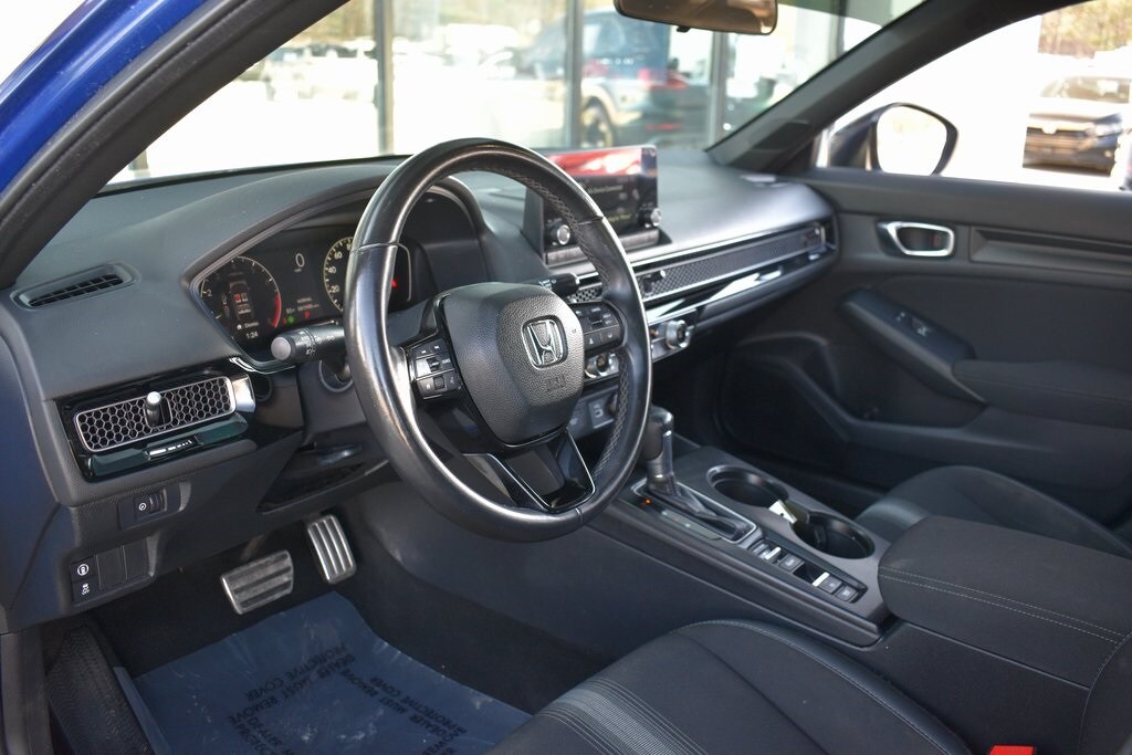 Blue 2022 Honda Civic Sport FWD CVT 2.0L I4 DOHC 16V i-VTEC Black Cloth, 4-Wheel Disc Brakes, 8 Speakers, ABS brakes, Adaptive Cruise Control: Adaptive Cruise Control (ACC) with Low-Speed Follow, Air Conditioning, Alloy wheels, AM/FM radio, Apple CarPlay/Android Auto, Auto High-beam Headlights, Automatic temperature control, Brake assist, Bumpers: body-color, Cloth Seat Trim, Driver door bin, Driver vanity mirror, Electronic Stability Control, Emergency communication system: HondaLink, Exterior Parking Camera Rear, Forward collision: Collision Mitigation Braking System (CMBS) + FCW mitigation, Front reading lights, Fully automatic headlights, Illuminated entry, Leather Shift Knob, Passenger door bin, Power door mirrors, Power steering, Power windows, Radio data system, Radio: 180-Watt AM/FM Audio System, Rear side impact airbag, Rear window defroster, Remote keyless entry, Speed control, Steering wheel mounted audio controls, Wheels: 18" Gloss Black Alloy.