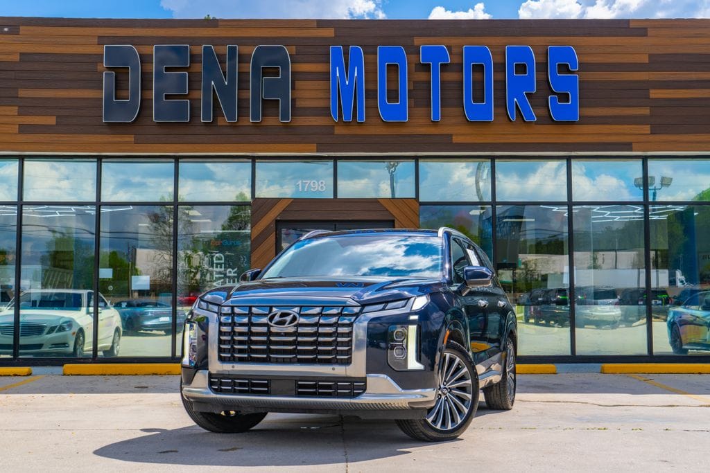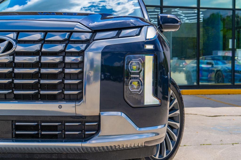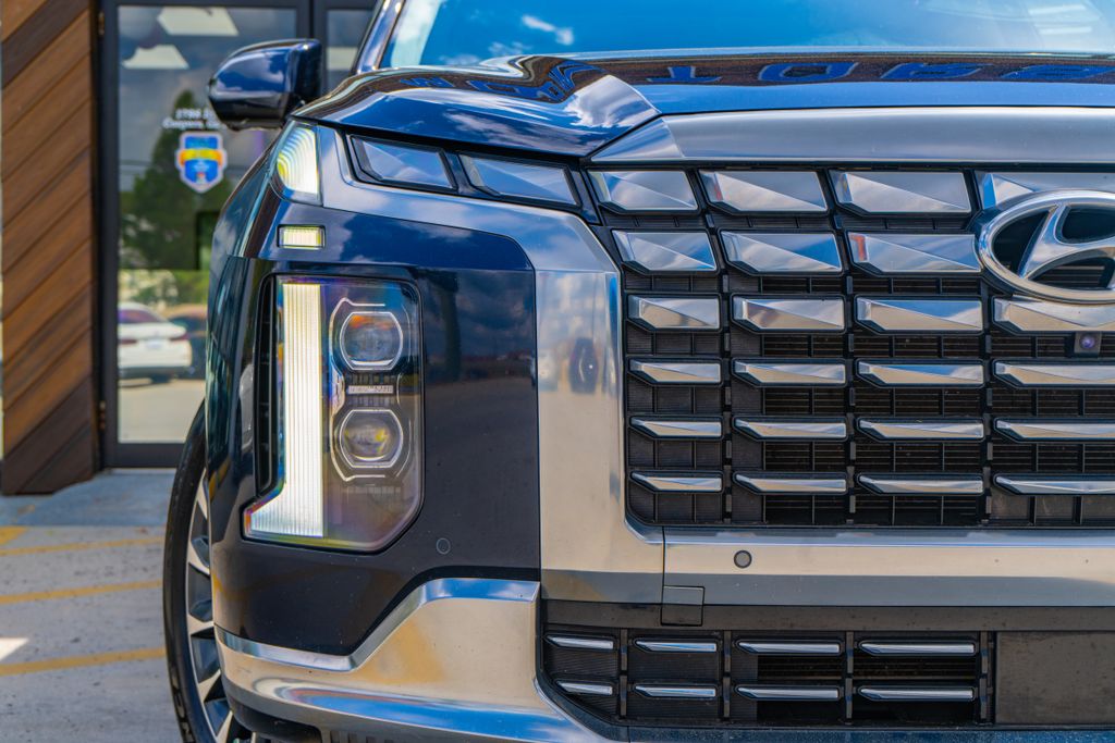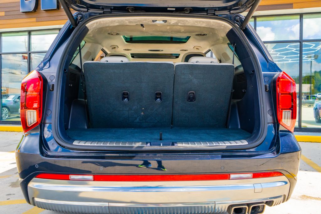 This vehicle comes equipped with Option Group 01, 12 Speakers, 3.510 Axle Ratio, 3rd row seats: split-bench, 4-Wheel Disc Brakes, ABS brakes, Air Conditioning, Alloy wheels, AM/FM radio: SiriusXM, Apple CarPlay & Android Auto, Auto High-beam Headlights, Auto-dimming door mirrors, Auto-dimming Rear-View mirror, Auto-leveling suspension, Automatic temperature control, Brake assist, Bumpers: body-color, Compass, Delay-off headlights, Driver door bin, Driver vanity mirror, Dual front impact airbags, Dual front side impact airbags, Electronic Stability Control, Emergency communication system: Blue Link Connected Car Service (3-year complimentary subscription), Exterior Parking Camera Rear, Four wheel independent suspension, Front anti-roll bar, Front Bucket Seats, Front Center Armrest, Front dual zone A/C, Front reading lights, Fully automatic headlights, Garage door transmitter: HomeLink, harman/kardon® Speakers, Heads-Up Display, Heated & Ventilated Front Bucket Seats, Heated door mirrors, Heated front seats, Heated rear seats, Heated steering wheel, Illuminated entry, Knee airbag, Low tire pressure warning, Memory seat, Navigation System, Occupant sensing airbag, Outside temperature display, Overhead airbag, Overhead console, Panic alarm, Passenger door bin, Passenger vanity mirror, Power door mirrors, Power driver seat, Power Liftgate, Power moonroof, Power passenger seat, Power steering, Power windows, Premium Nappa Leather Seat Trim, Radio data system, Radio: AM/FM/MP3 Premium Audio System, Rain sensing wipers, Rear air conditioning, Rear anti-roll bar, Rear audio controls, Rear reading lights, Rear side impact airbag, Rear window defroster, Rear window wiper, Reclining 3rd row seat, Remote keyless entry, Security system, Speed control, Speed-sensing steering, Split folding rear seat, Spoiler, Steering wheel mounted audio controls, Tachometer, Telescoping steering wheel, Tilt steering wheel, Traction control, Trip computer, Turn signal indicator mirrors, Variably intermittent wipers, Ventilated front seats, Ventilated rear seats, and Wheels: 20" x 7.5J Calligraphy Exclusive Alloy .