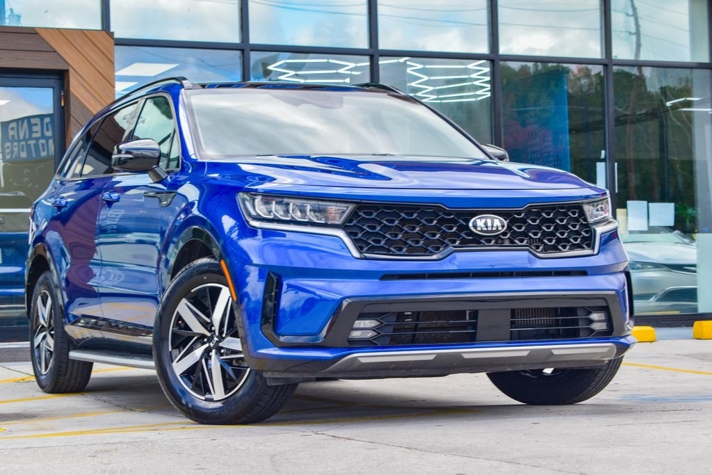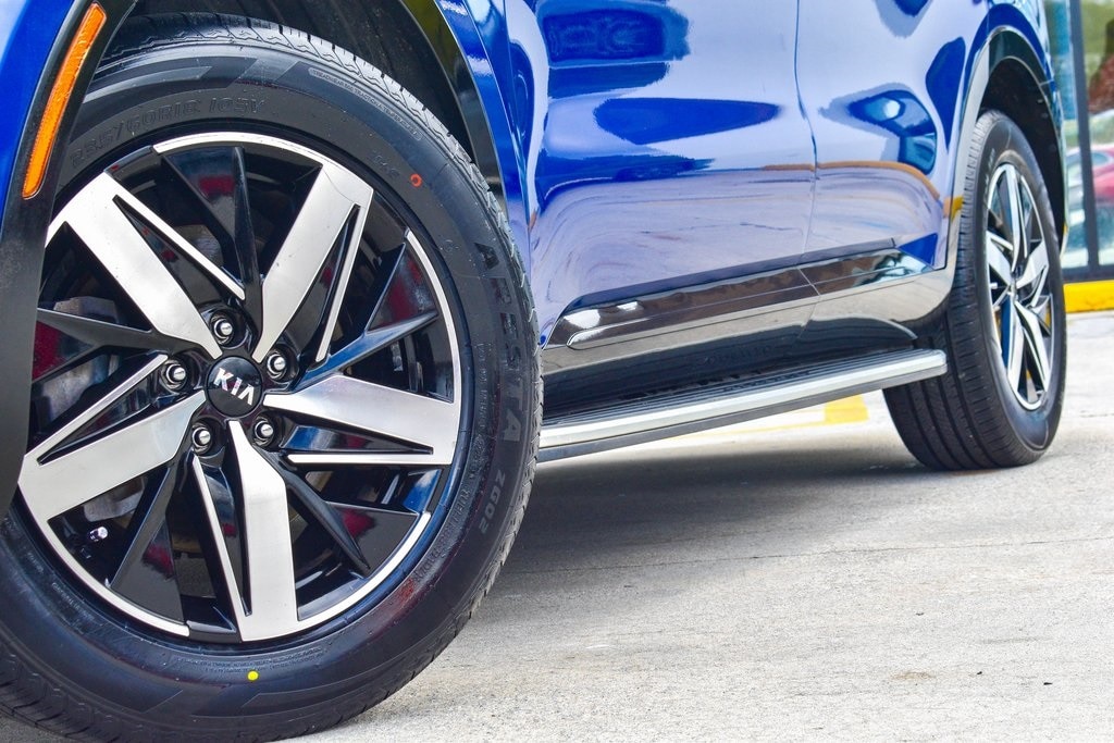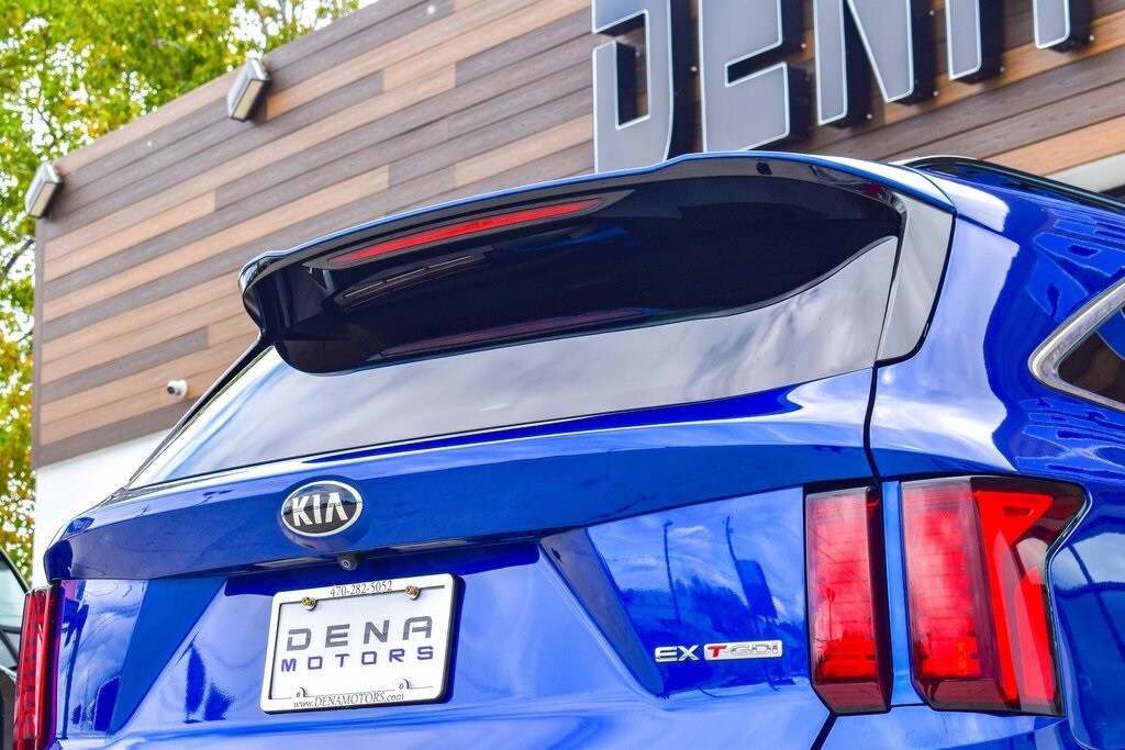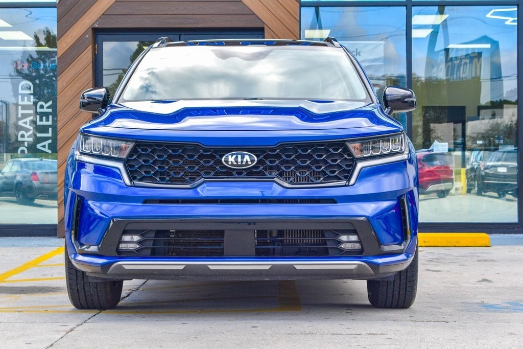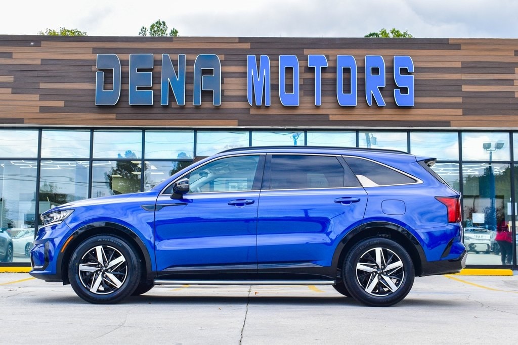 Sapphire Blue 2021 Kia Sorento EX FWD 8-Speed DCT 2.5L I4 DGI Turbocharged DOHC 16V LEV3-ULEV70 281hp 18" Machine-Finished Alloy Wheels, 3rd row seats: split-bench, 6 Speakers, Alloy wheels, AM/FM radio: SiriusXM, Apple CarPlay & Android Auto, Auto High-beam Headlights, Auto-Dimming Mirror w/HomeLink, Brake assist, Bumpers: body-color, Electronic Stability Control, Exterior Parking Camera Rear, Front Bucket Seats, Front Center Armrest, Fully automatic headlights, Heated door mirrors, Heated Front Bucket Seats, Heated front seats, Interior Lighting Kit, Leather Shift Knob, Leather steering wheel, Panoramic Sunroof Package, Power door mirrors, Power driver seat, Power Liftgate, Power steering, Power Sunroof w/Power Sunshade, Power windows, Premium Leatherette Seat Trim, Radio: AM/FM Audio System, Remote keyless entry, Roof rack: rails only, Side Step Bars, Speed control, Speed-sensing steering, Split folding rear seat, Spoiler, Steering wheel mounted audio controls, Traction control, Turn signal indicator mirrors.