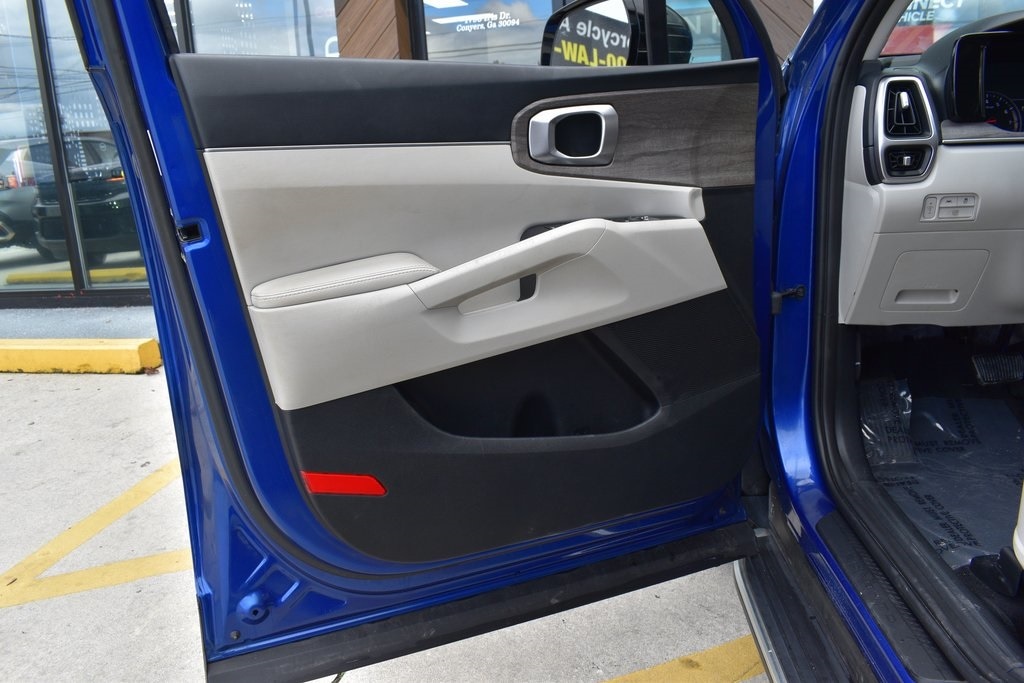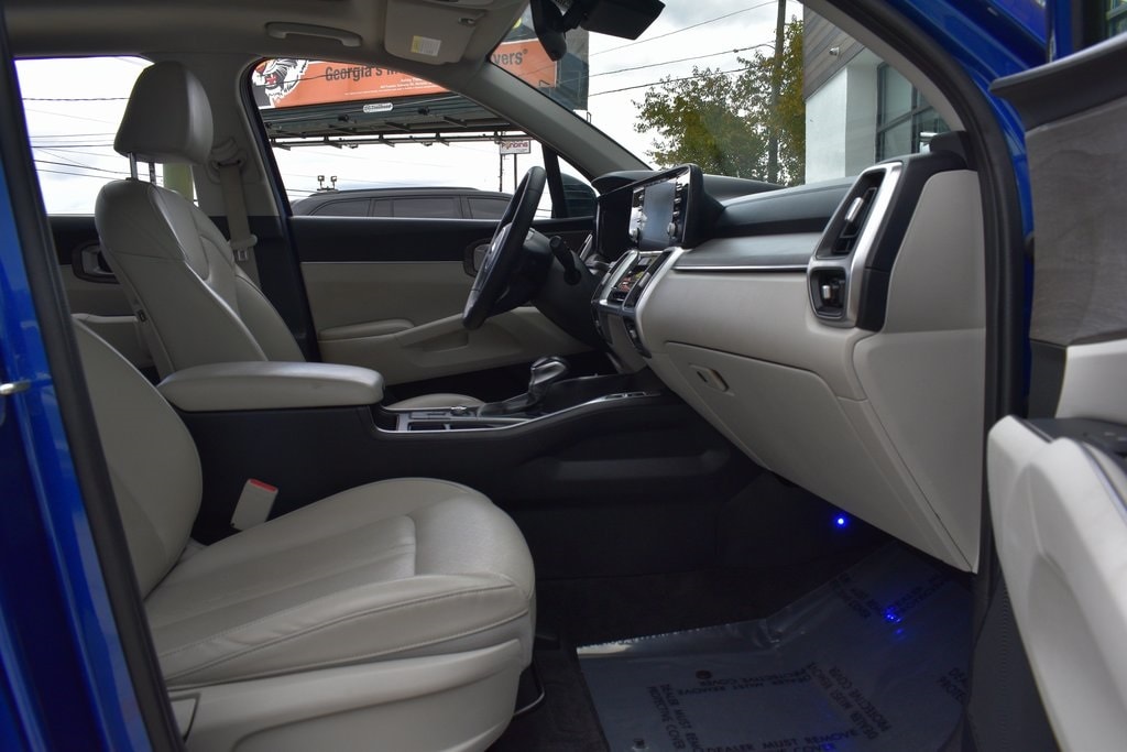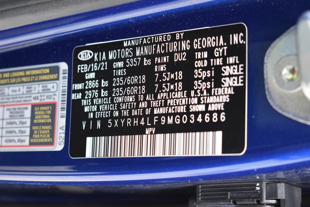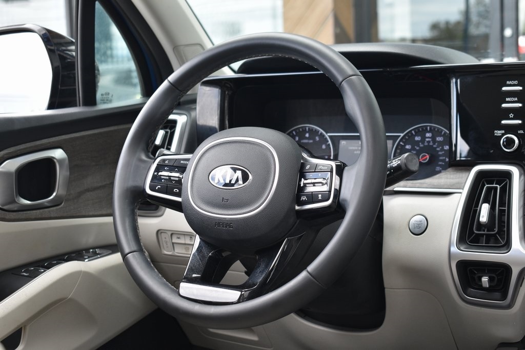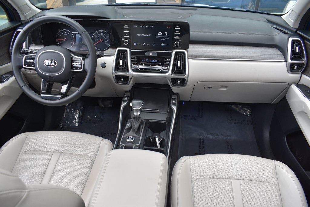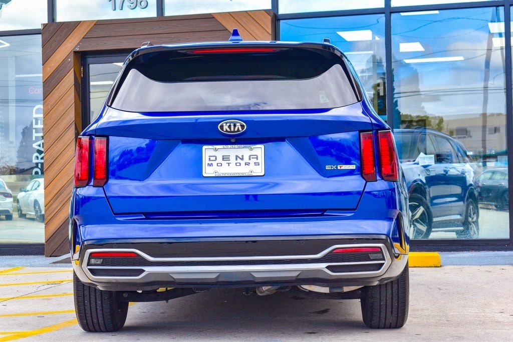 Sapphire Blue 2021 Kia Sorento EX FWD 8-Speed DCT 2.5L I4 DGI Turbocharged DOHC 16V LEV3-ULEV70 281hp 18" Machine-Finished Alloy Wheels, 3rd row seats: split-bench, 6 Speakers, Alloy wheels, AM/FM radio: SiriusXM, Apple CarPlay & Android Auto, Auto High-beam Headlights, Auto-Dimming Mirror w/HomeLink, Brake assist, Bumpers: body-color, Electronic Stability Control, Exterior Parking Camera Rear, Front Bucket Seats, Front Center Armrest, Fully automatic headlights, Heated door mirrors, Heated Front Bucket Seats, Heated front seats, Interior Lighting Kit, Leather Shift Knob, Leather steering wheel, Panoramic Sunroof Package, Power door mirrors, Power driver seat, Power Liftgate, Power steering, Power Sunroof w/Power Sunshade, Power windows, Premium Leatherette Seat Trim, Radio: AM/FM Audio System, Remote keyless entry, Roof rack: rails only, Side Step Bars, Speed control, Speed-sensing steering, Split folding rear seat, Spoiler, Steering wheel mounted audio controls, Traction control, Turn signal indicator mirrors.